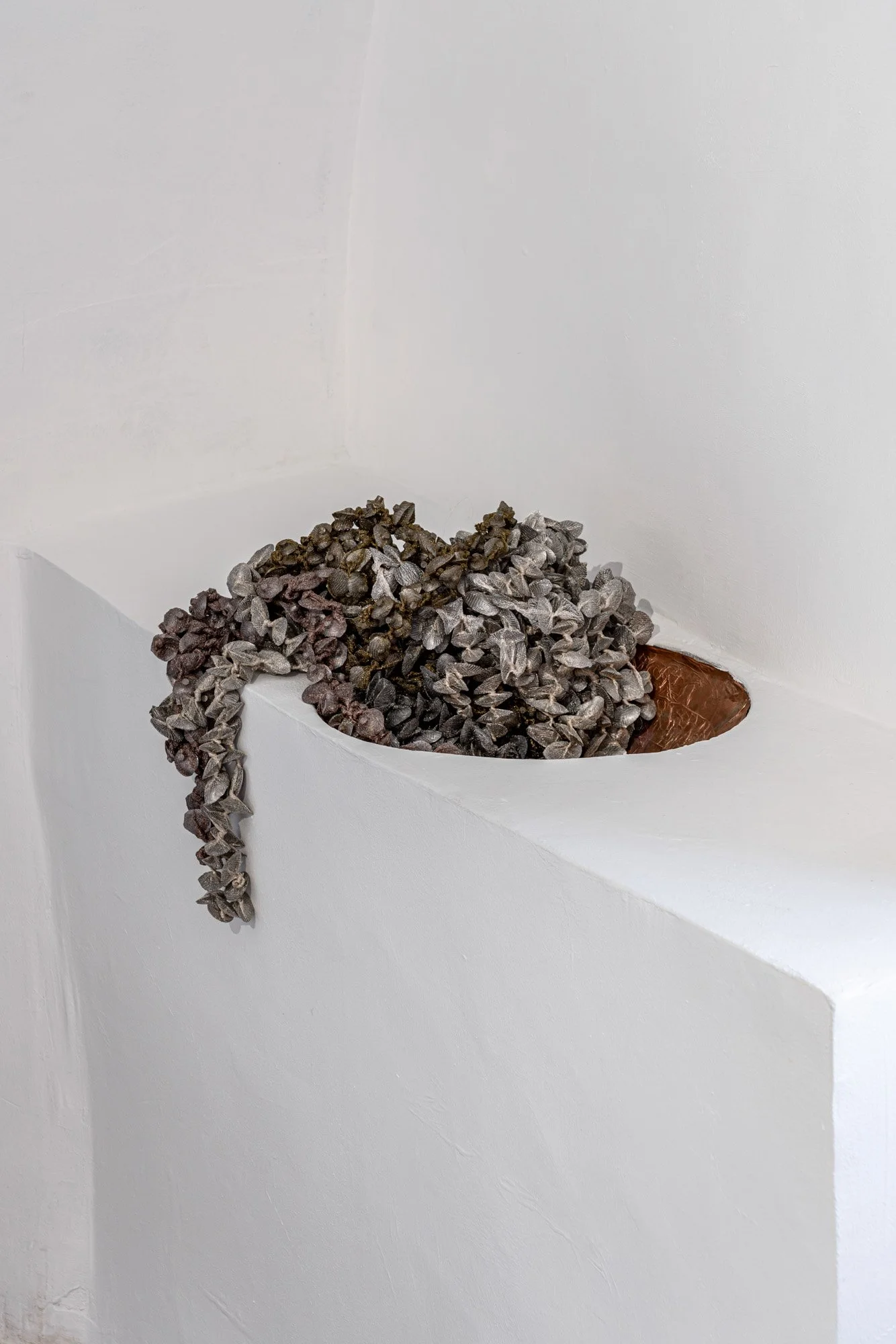 Piccoli elementi di varia natura — provenienti da esperienze del passato e del presente — vengono tenuti insieme attraverso il gesto dell’attorcigliare: un movimento che avvolge, protegge e lega. Mediante questo gesto, la maglia in titanio che compone la serie w(Isteria), si trasforma da materia malleabile a struttura solida, ancorandosi saldamente a ciò che contiene.